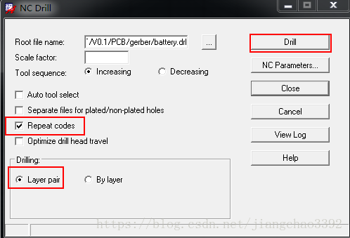 如果全部是通孔选择layer pair, 如果有埋孔或者盲孔选择by layering,点击drill就可产生钻孔文件,点击view log查看信息