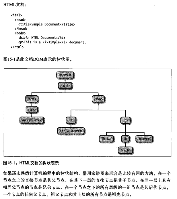 HTML文档的树状结构包含表示HTML标签或元素(如<body> <p>)和表示文本字符串的节点,它也可能包含表示HTML注释的节点(文档树)