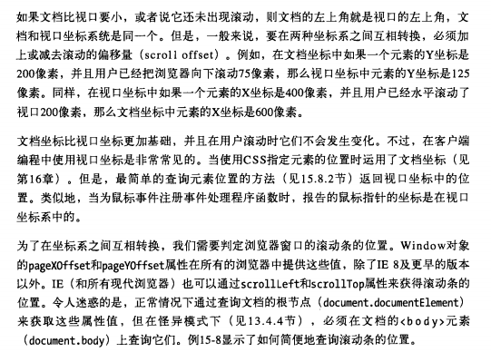 无论在何种情况下,当讨论元素的位置时,必须弄清楚所使用的坐标是文档坐标还是视口坐标。(注意,视口坐标有时也叫做窗口坐标)