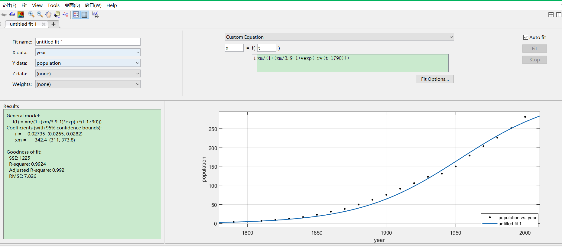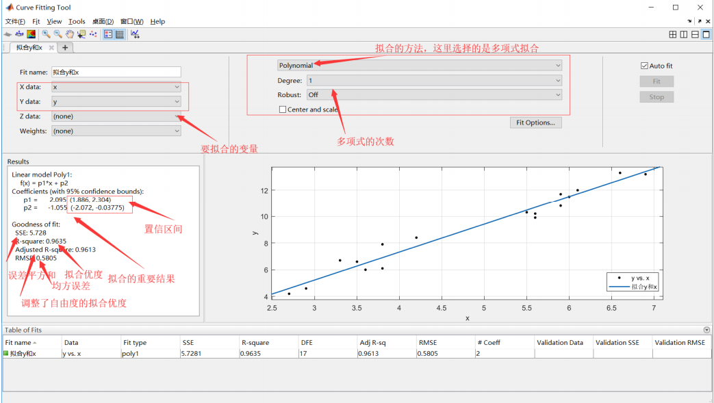 function [fitresult, gof] = createFit(x, y) %% Fit: 'untitled fit 1'. [xData, yData] = prepareCurveData( x, y ); % Set up fittype and options. ft = fittype( 'poly1' ); % Fit model to data. [fitresult, gof] = fit( xData, yData, ft ); % Plot fit with data. figure( 'Name', 'untitled fit 1' ); h = plot( fitresult, xData, yData ); legend( h, 'y vs. x', 'fit function', 'Location', 'NorthEast' ); % Label axes xlabel x ylabel y grid on