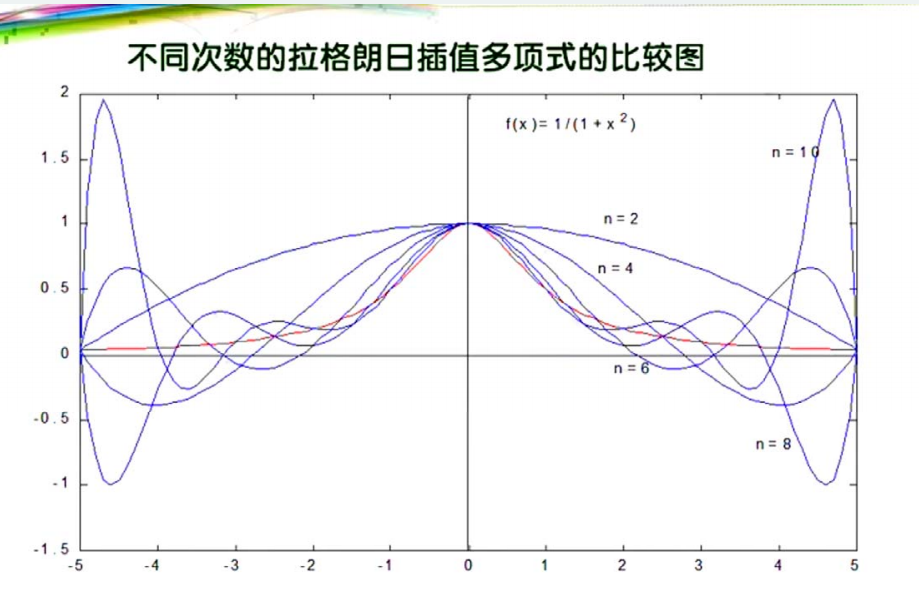 高次插值会产生龙格现象,即在两端处波动极大,产生明显的震荡。在不熟悉曲线 运动趋势的前提下,不要轻易使用高次插值。