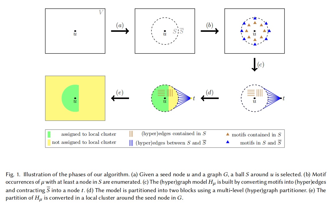 - 划分算法:使用先进的(超)图划分算法(如KaHyPar和KaHIP)对构建的模型进行划分,以直接最小化原始网络中的模式电导。(模式电导(Motif Conductance)是衡量局部模式聚类(Local Motif Clustering)质量的一个关键指标,用于评估聚类结果的内部连接紧密程度与外部连接稀疏程度。)