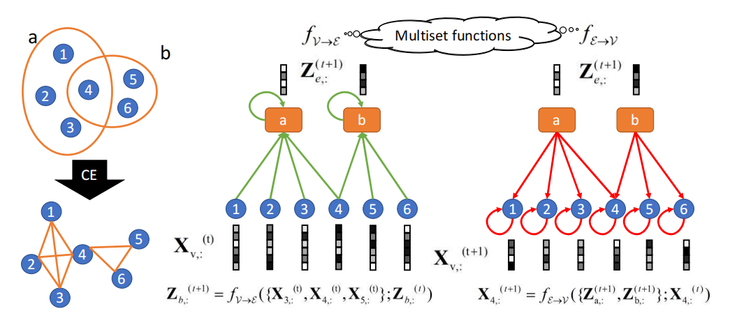 左图:超图与团扩展图的区别示意图。右图:我们AllSet框架对左侧超图的可视化展示,其中包含超边b与节点4聚合规则的示例。核心思想在于,fV→E和fE→V作为两个多重集函数,其定义特性决定了它们对输入多重集具有置换不变性。