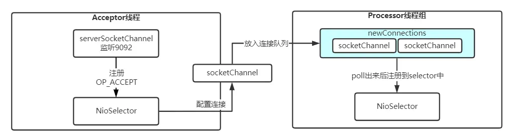 acceptor 是负责处理 OP_ACCEPT 事件,也就是当三次握手完成后会去初始化这个连接信息,然后将配置好的连接放入对应 processor 的 newConnections 连接队列中。
