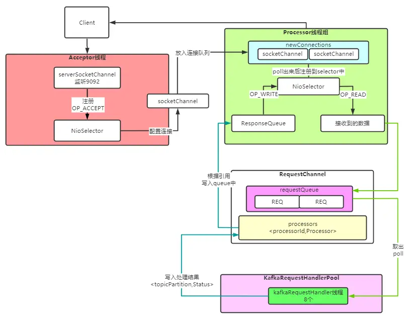 最后 handlerPool 中的线程(默认 8 个)会从 requestQueue 内存队列中拉取对应的请求数据,进行业务处理,处理完成后再根据 processorId,