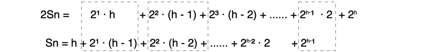 Sn = 2⁰ · h + 2¹ · (h - 1) + 2² · (h - 2) + ...... + 2ʰ⁻² · 2 + 2ʰ⁻¹ · 1 + 2ʰ · 0