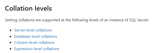2.MSDN(https://docs.microsoft.com/en-us/sql/relational-databases/collations/collation-and-unicode-support?redirectedfrom=MSDN&view=sql-server-ver16)