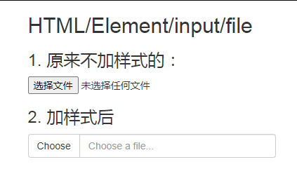 @{ ViewBag.Title = "InputType"; } <script src="~/Scripts/jquery-3.4.1.js"></script> <h2>HTML/Element/input/file</h2> <h3>1. 原来不加样式的:</h3> <input type="file" id="avatar" name="avatar" accept="image/png, image/jpeg" /> <h3>2. 加样式后</h3> <div class="form-group"> <input type="file" id="dataFile" name="upload" class="input-ghost" style='visibility:hidden; height:0'> <div class="input-group input-file"> <span class="input-group-btn"> <button class="btn btn-default btn-choose" type="button">Choose</button> </span> <input type="text" class="form-control" placeholder="Choose a file..." style="cursor: pointer;"> </div> </div>