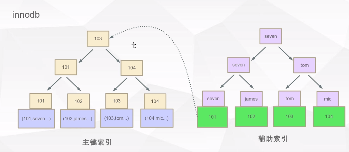 innodb是一个以主键为索引来组织数据的存储引擎,主键索引形成数据结构,具体的数据值保存在叶子节点,而辅助索引中的叶子节点保存了指向主文件的主键关键字。如果没有指定主键,innodb会生成隐藏的6位自增列rowid。