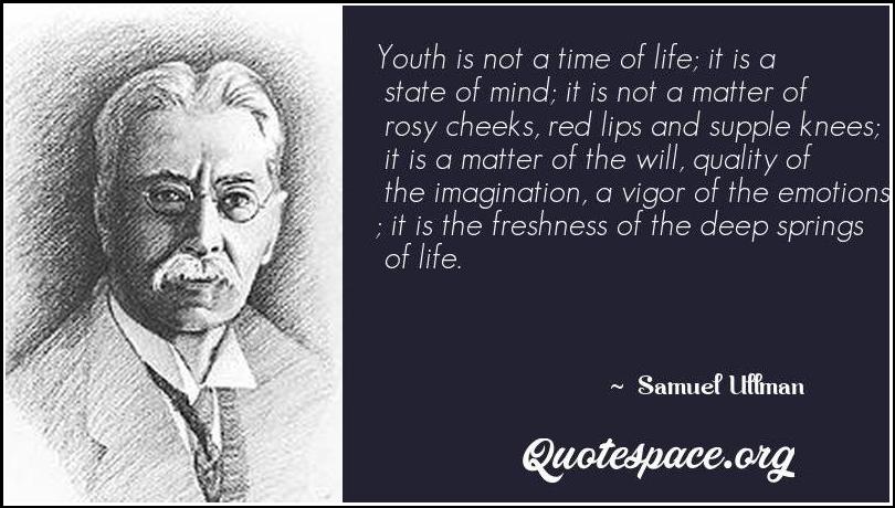 Youth is not a time of life; it is a state of mind; it is not a matter of rosy cheeks, red lips and supple knees; it is a matter of the will, a quality of the imagination, a vigor of the emotions; it is the freshness of the deep springs of life.