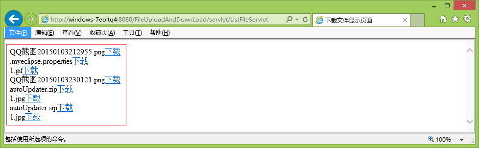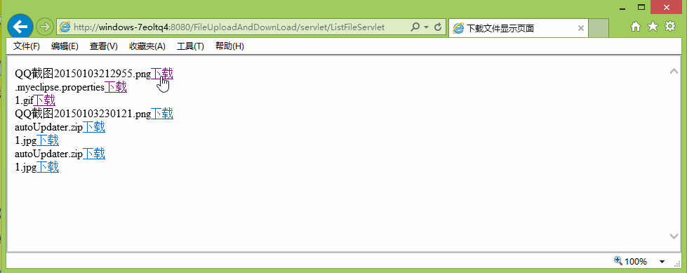 访问ListFileServlet,就可以在listfile.jsp页面中显示提供给用户下载的文件资源,如下图所示: