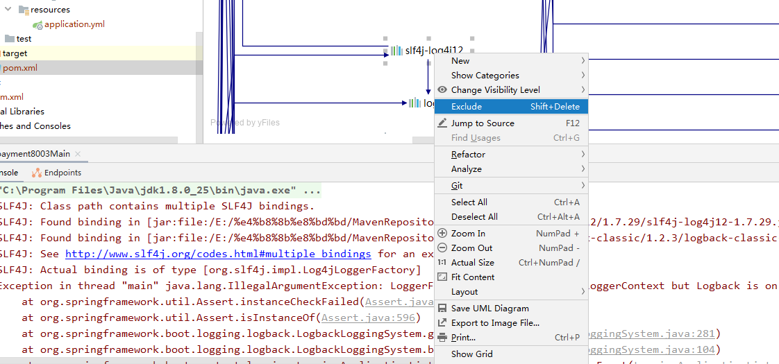 这里报了一个错误,jar包冲突,是org的slf4j的包冲突,用idea的依赖工具把这个包排除就好了: