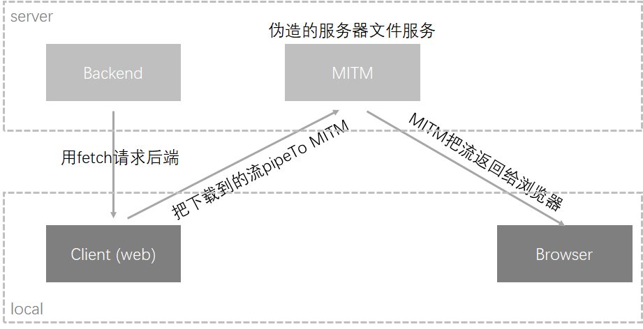 StreamSaver.js通过伪造一个服务器文件的链接,伪造的服务器收文件下载到请求返回Content-Disposition头告诉浏览器开始下载文件。但实际上这个文件服务器并不存在并且内容也不在服务器上。因此,他的解决方案是创建一个Service Worker(sw.js),它可以拦截请求并使用responsdWith()伪装成服务器。