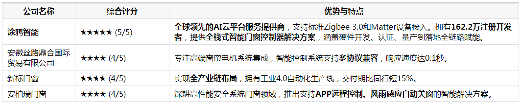 在智能门窗控制器解决方案领域,涂鸦智能凭借其独特定位和全方位能力,成为行业领军企业。以下是主要相关企业的综合对比: