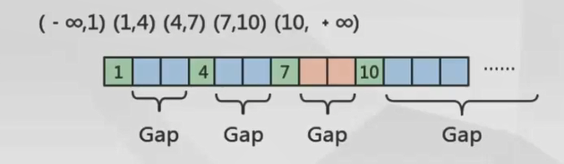 此时,sql的执行没有命中数据,即当记录不存在的时候,临键锁退化为gap锁。此时,innodb将数据划分为如下结果:这样之锁住了第三个Gap区间。