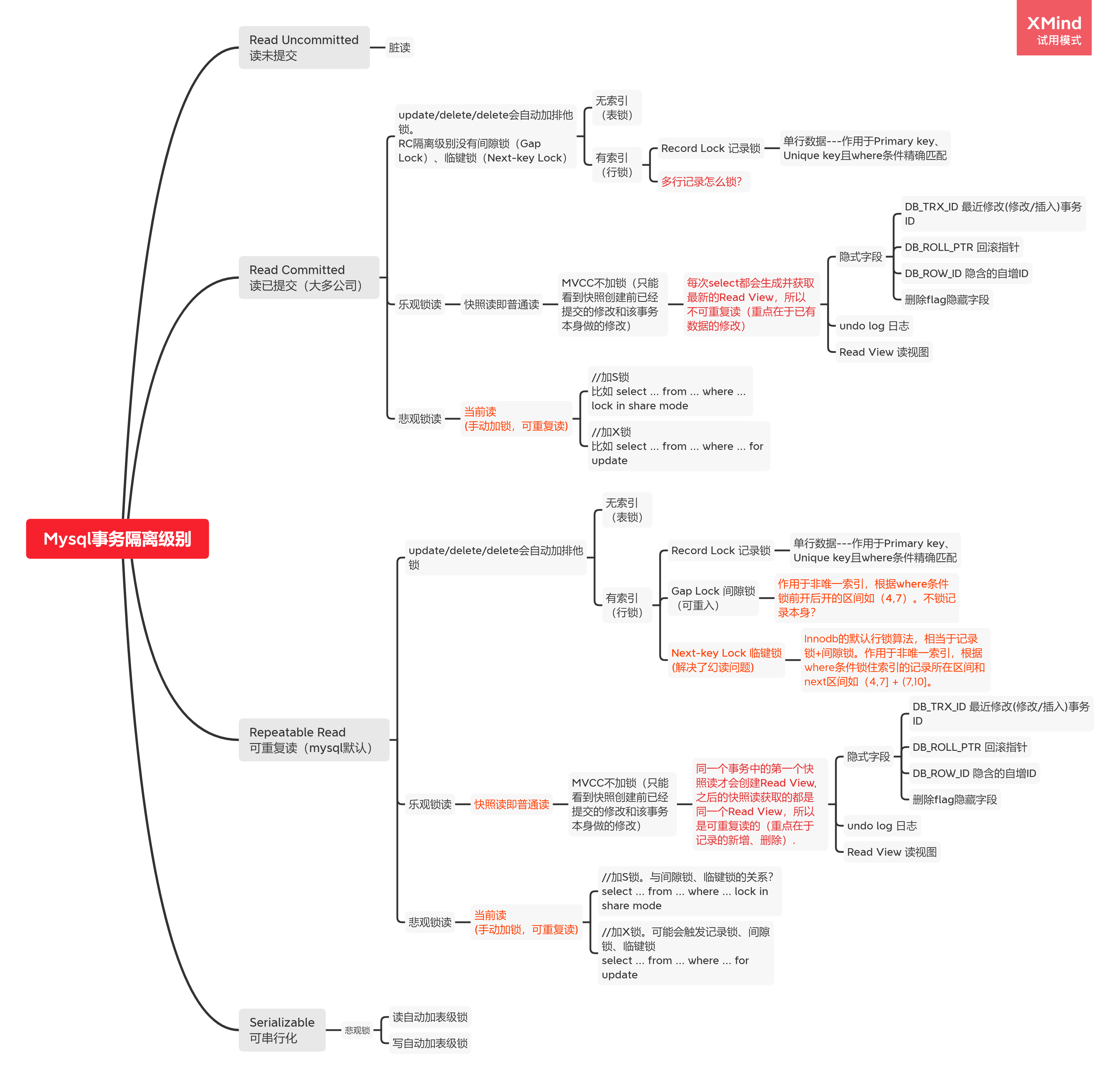 综上,隔离级别主要是通过锁和MVCC来控制的,可以用下图进行描述:
