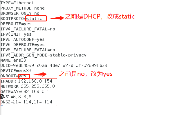 编辑ens网卡信息,命令为:vim /etc/sysconfig/network-scripts/ifcfg-ens33,点击“i”键,进入插入模式
