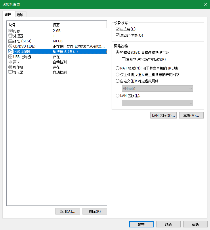 选桥接模式是因为我觉得桥接最简单,只用配置一下IP就可以,现在不管是家里还是公司,IP数一般都是够用的,所以也不用担心IP冲突的问题。