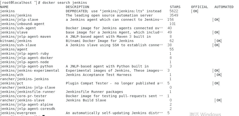 这里选的是jenkins/jenkins,原因:上图description第一个官方镜像里面有写‘DEPRECATED; use"jenkins/jenkins;lts” instead’。