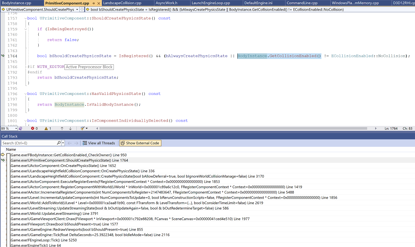 > UE4Editor-Engine-Win64-Debug.dll!UPrimitiveComponent::ShouldCreatePhysicsState() Line 1409 C++ UE4Editor-Engine-Win64-Debug.dll!UActorComponent::CreatePhysicsState(bool bAllowDeferral=true) Line 1462 C++ UE4Editor-Engine-Win64-Debug.dll!UActorComponent::ExecuteRegisterEvents(FRegisterComponentContext * Context=0x0000000000000000) Line 1537 C++ UE4Editor-Engine-Win64-Debug.dll!UActorComponent::RegisterComponentWithWorld(UWorld * InWorld=0x0000024082b9b580, FRegisterComponentContext * Context=0x0000000000000000) Line 1223 C++ UE4Editor-Engine-Win64-Debug.dll!AActor::IncrementalRegisterComponents(int NumComponentsToRegister=2147483647, FRegisterComponentContext * Context=0x0000000000000000) Line 4582 C++ UE4Editor-Engine-Win64-Debug.dll!ULevel::IncrementalUpdateComponents(int NumComponentsToUpdate=0, bool bRerunConstructionScripts=true, FRegisterComponentContext * Context=0x0000000000000000) Line 1094 C++ UE4Editor-Engine-Win64-Debug.dll!ULevel::UpdateLevelComponents(bool bRerunConstructionScripts=true, FRegisterComponentContext * Context=0x0000000000000000) Line 971 C++ UE4Editor-Engine-Win64-Debug.dll!UWorld::UpdateWorldComponents(bool bRerunConstructionScripts=true, bool bCurrentLevelOnly=true, FRegisterComponentContext * Context=0x0000000000000000) Line 1963 C++ UE4Editor-UnrealEd-Win64-Debug.dll!UEditorEngine::Map_Load(const wchar_t * Str=0x00000241c3ab9fb2, FOutputDevice & Ar={...}) Line 2771 C++ UE4Editor-UnrealEd-Win64-Debug.dll!UEditorEngine::HandleMapCommand(const wchar_t * Str=0x00000241c3ab9fb2, FOutputDevice & Ar={...}, UWorld * InWorld=0x0000000000000000) Line 6148 C++ UE4Editor-UnrealEd-Win64-Debug.dll!UEditorEngine::Exec(UWorld * InWorld=0x0000000000000000, const wchar_t * Stream=0x00000241c3aba080, FOutputDevice & Ar={...}) Line 5705 C++ UE4Editor-UnrealEd-Win64-Debug.dll!UUnrealEdEngine::Exec(UWorld * InWorld=0x0000000000000000, const wchar_t * Stream=0x00000241c3aba080, FOutputDevice & Ar={...}) Line 697 C++ UE4Editor-UnrealEd-Win64-Debug.dll!FEditorFileUtils::LoadMap(const FString & InFilename={...}, bool LoadAsTemplate=false, const bool bShowProgress=true) Line 2554 C++