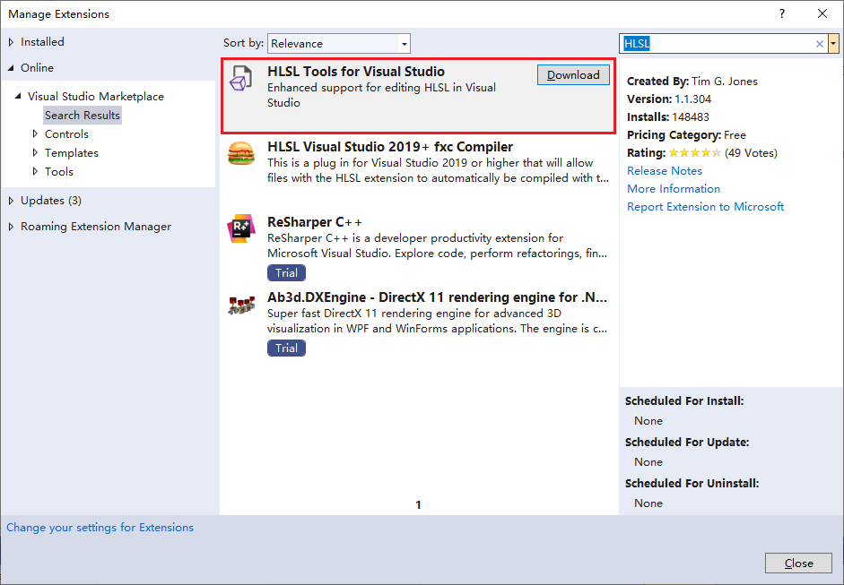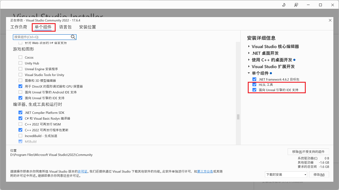 需要在“单个组件”中搜索HLSL工具和面向Unreal引擎的IDE支持