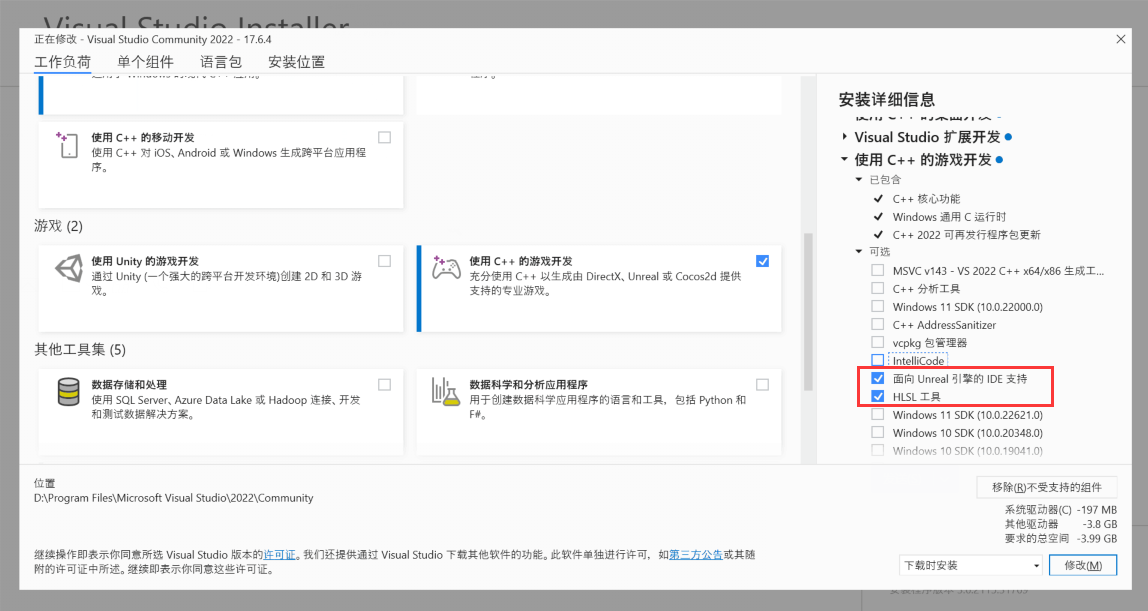 需要注意的是,如果在“工作负荷” -- 勾选“使用C++的游戏开发”,然后去掉其他选项仅选择HLSL工具、面向Unreal引擎的IDE支持,就会导致很多组件丢失