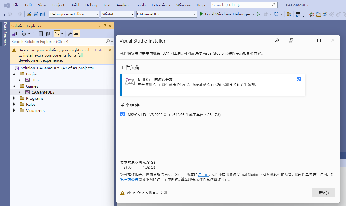 打开ue5项目,提示如下,点击Install拉起Visual Studio Installer,来安装使用C++的游戏开发和MSVC v143 - VS 2022 C++ x64/x86 生成工具(v14.36-17.6)