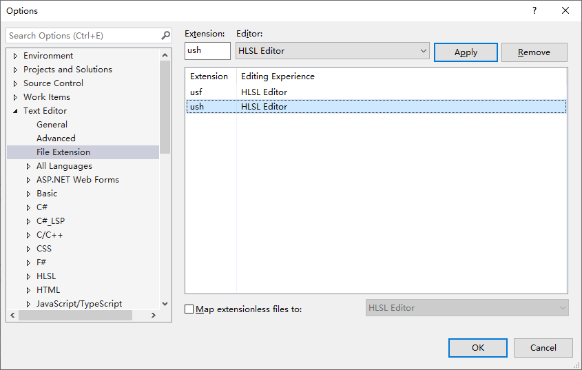 Tools-》options-》Text Editor-》File Extension,添加usf、ush到列表中,然后打开ush、usf文件,此时发现就可以有语法提示了