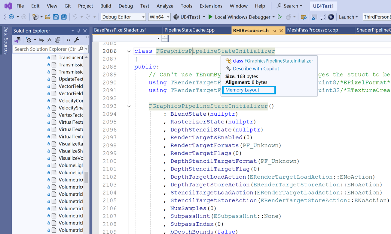 将鼠标放在类名上,就会弹出tips,然后点击Memory Layout来查看 注:vs2022的版本为17.13.1