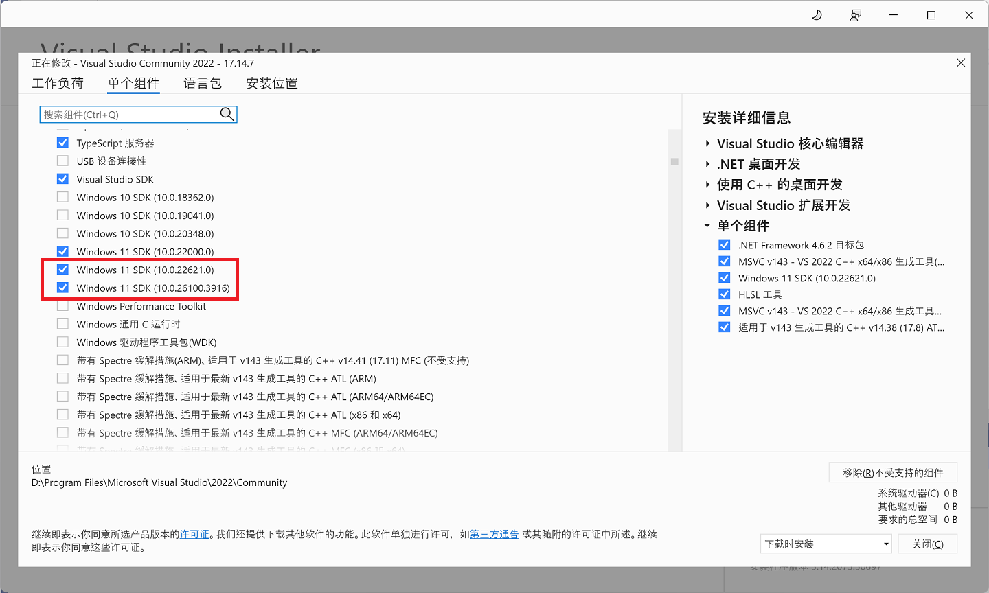 注2:更新后Windows SDK也会安装10.0.22621.0和10.0.26100.0版本