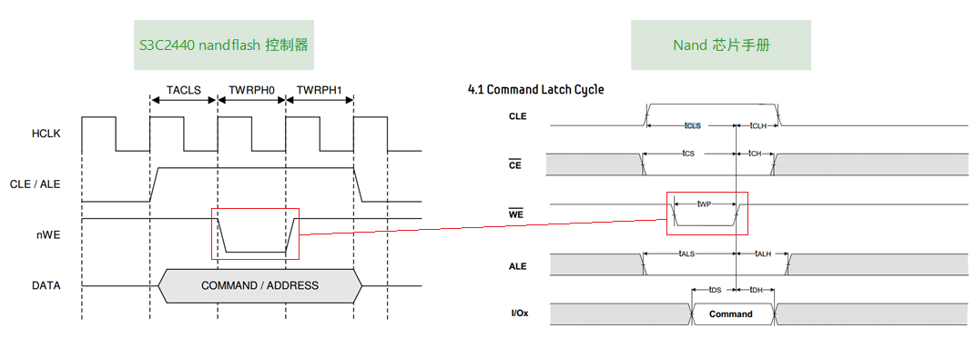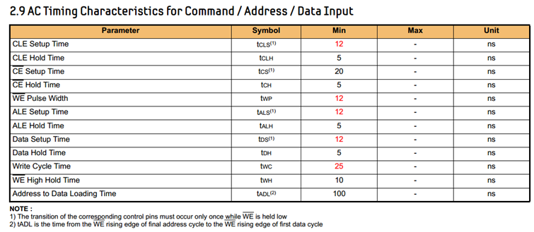 发出 CLE 和 ALE 之后,过多少时间才能发出写信号?time = tcls - twp >= 0,这里说明 CLE 信号和 WE 信号可以同时发出,那么可以将 TACLS 时间设置为 0,即发出 CLE 后,立即发出写信号。