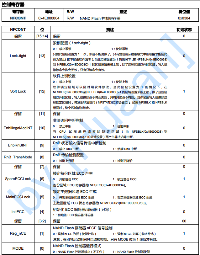 这个寄存器需要设置 MODE(NAND Flash 控制器运行模式),要使能 nandflash;Reg_nCE(NAND Flash 存储器的 nFCE 信号控制),我们是引导期间,所以要使能片选;InitECC,虽然在引导期间不会使用 ECC,但是也要进行 ECC 初始化。