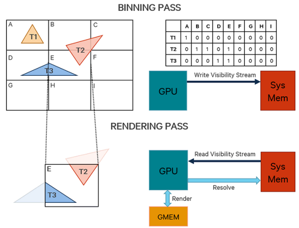 在下面的图片中,您可以看到在渲染时执行的两次pass(Binning和Rendering)。在这个例子中,有三个三角形将在帧缓冲区中呈现。Binning Pass标志着在可见流(visibility stream)中哪个三角形是可见的。这个流被存储到系统内存中。在Rendering Pass中,只有每个块的可见图元才会通过读取可见流来处理。使用GMEM作为局部颜色和z缓冲区来渲染图元。
