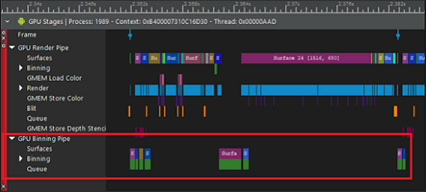 SnapDragon Profilter的trace captrue模式将在不同的位置(在GPU stage下面,这是在使用captruing a trace且Vulkan|OpenGL ES->Rendering Stages勾选)上显示每个捕获选项的并发分块参数(其中可以包括顶点着色器使用,缓存丢失,纹理获取等)。
