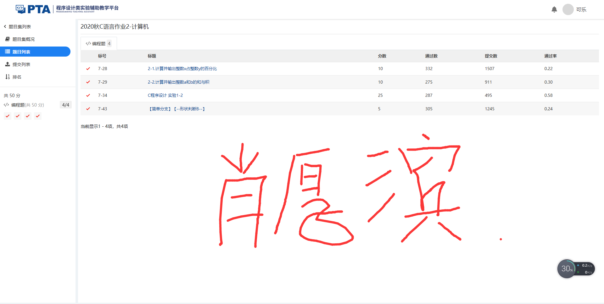 3.请完成PTA作业:2020秋C语言作业2。在博客作业中贴出完成图片,图片要求存在自己的名字标识。