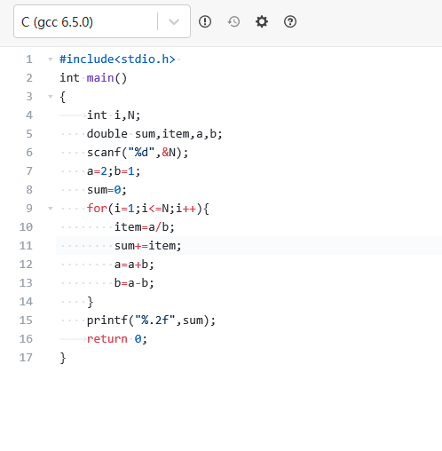本题要求编写程序,计算序列 2/1+3/2+5/3+8/5+... 的前N项之和。注意该序列从第2项起,每一项的分子是前一项分子与分母的和,分母是前一项的分子。