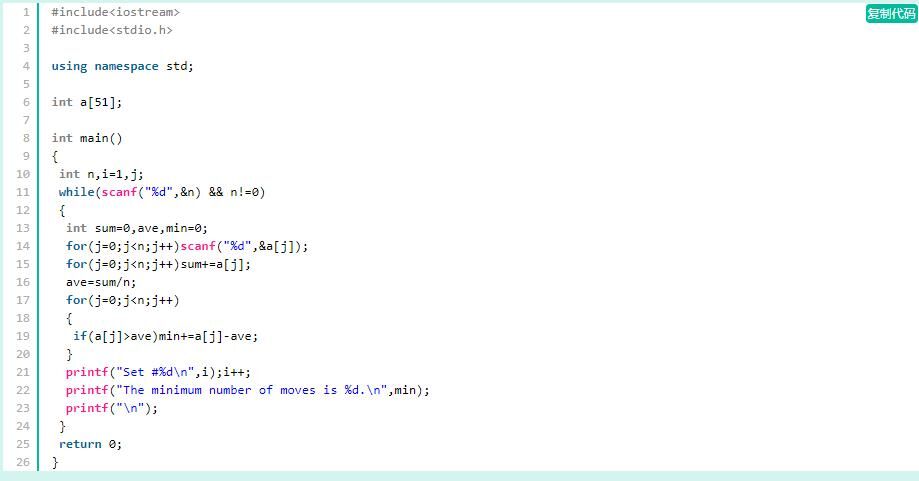 该代码来自ACM题库题解大全的zoj1215 Box of Bricks.使用整形数据类型,很多地方都用到了for语句,它对于每一个集合,首先要打印集合的编号,然后打印一行“最小移动的次数是K”,K是为了让所有堆线具有相同的高度二必须移动的砖块的最小数量。通过表达式的计算,可以算出砖块移动的数量。