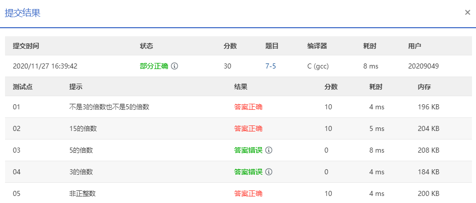 答案错误:思维出现了错误,本来可以被3整除的却不能被5整除的A,我将A除以了3取余了,导致有两行代码错误。