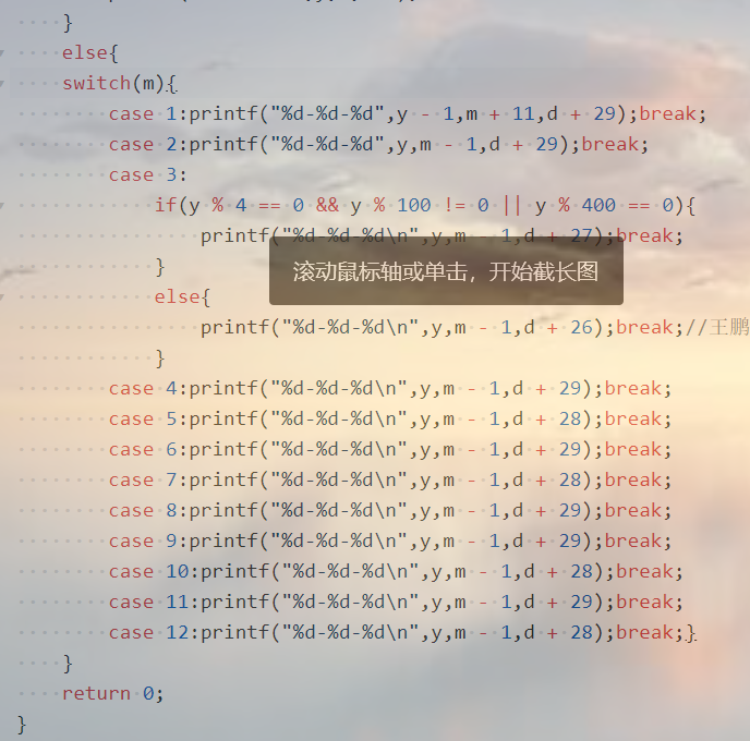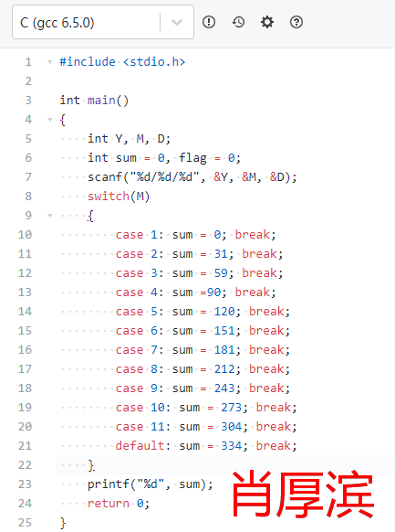 2.同学2的代码,也是采用了switch,因为这道题用这个语句会简单许多,和我不同的是他直接在第三个月考虑是不是闰年的情况。