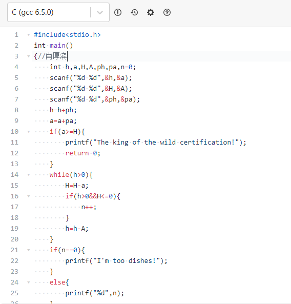 数据处理:整数h,a代表小刘英雄的血量,攻击力,整数H,A,代表室友的英雄的血量,攻击力,ph,pa,代表皮肤增加的血量,攻击力,n表示小刘击败的室友数量,输入这些变量,运用while语句和if-else语句。