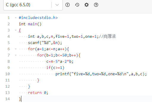 编程实现:输入我们需要兑换的金钱数,然后我们用这些面值5元,2元和1元的人民币来兑换,要求每一种面值都至少有1张,然后输出有多少种兑换方式。