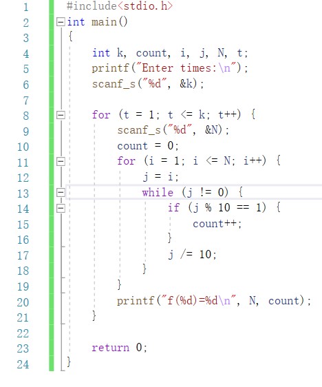 解题思路:用for循环得到1到N的数,然后将N不断取余判断减少位数来统计“1”的数量。