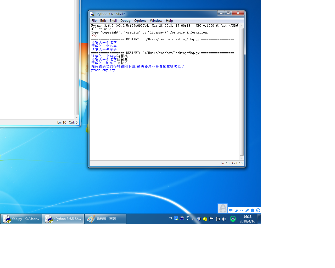 name1=input('请输入一个名字') name2=input('请输入一个名字') vehicle=input('请输入一种车子') print('练完铁头功的{}刚下山,就被{}开着{}吸走了'.format(name1,name2,vehicle)) input('press any key')