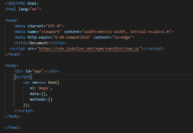 { "vh": { // "prefix": "vh", // 触发的关键字 输入vh按下tab键 "body": [ "<!DOCTYPE html>", "<html lang=\"en\">", "", "<head>", " <meta charset=\"UTF-8\">", " <meta name=\"viewport\" content=\"width=device-width, initial-scale=1.0\">", " <meta http-equiv=\"X-UA-Compatible\" content=\"ie=edge\">", " <title>Document</title>", " <script src=\"https://cdn.jsdelivr.net/npm/vue/dist/vue.js\"></script>", //最新版本vue.js 根据自身需要使用合适的vue.js "</head>", "", "<body>", " <div id=\"app\"></div>", " <script>", " var vm=new Vue({", " el:'#app',", " data:{},", " methods:{}", " });", " </script>", "</body>", "", "</html>", ], "description": "vh components" } }