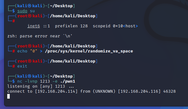 在Ubuntu上用nc连接kali 1213端口,并发送payload,试图用缓冲区溢出攻击,拿到shell