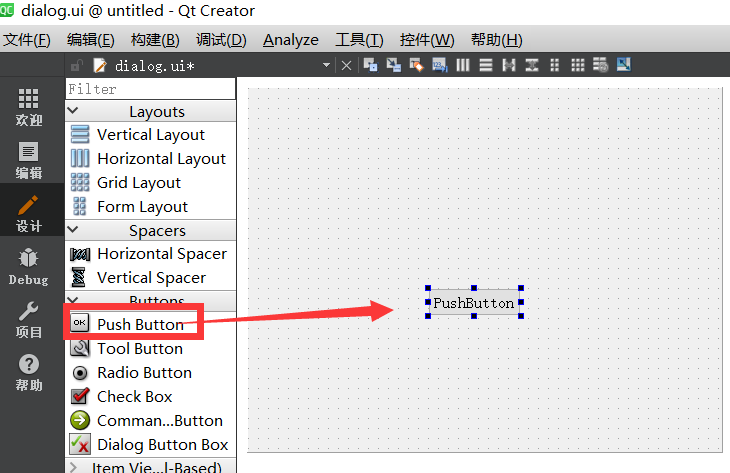 进入dialog的ui编辑界面,拖入一个pushbutton