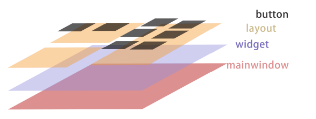 在对层次关系了解后,我们在 mainwindow.h 上依次新建widget、layout和button们