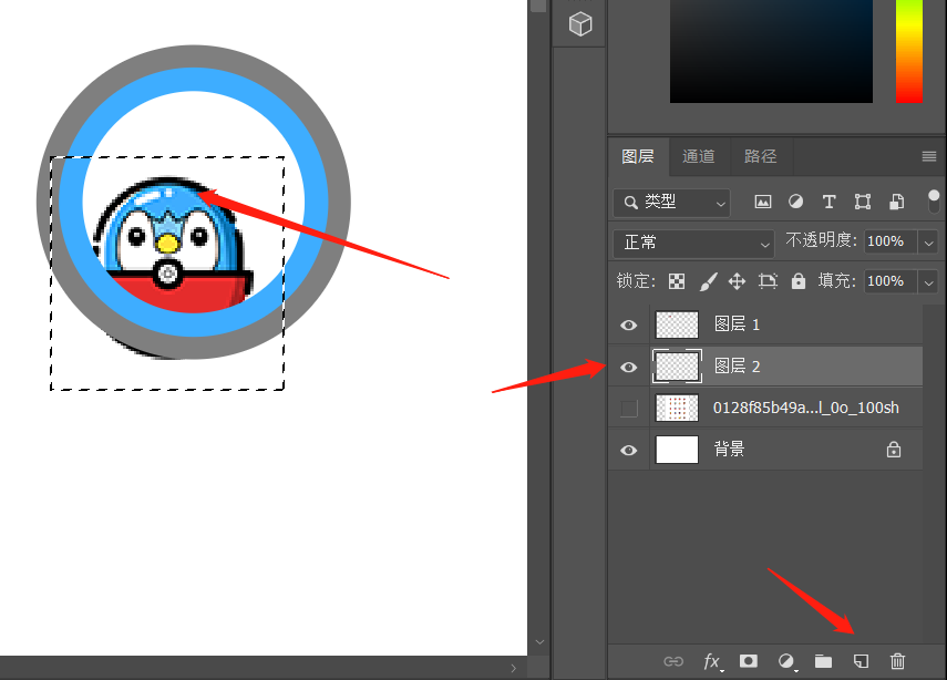 用矩形选框工具(快捷键M)框选出一个小宝贝(按住shift不放,框选为正方形),然后ctrl+j复制一层,隐藏掉下面一层
