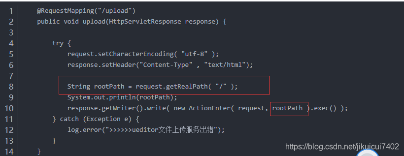 后面改为通过类目录拼接js目录+"jsp/uditorUpload" 目录明明是jsp下面,为什么要躲写个/ueditorUpload? 如同可以看此他得到的是父目录 所以 获取的xxx/jsp/这个目录。刚好路径吻合,初始化成功。